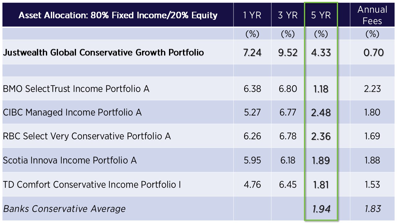 This analysis is a comparison of the largest mutual fund asset allocation programs offered by each of the 5 largest Canadian banks and Justwealth, an independent, low-cost online Canadian Portfolio Manager. Each program maintains a series of portfolios ranging from low risk to high risk. The categories used in the analysis attempt to compare portfolios with similar allocations to fixed income and equity securities. The five categories and approximate asset allocations are as follows:
