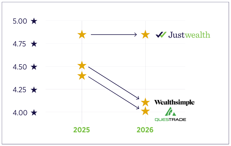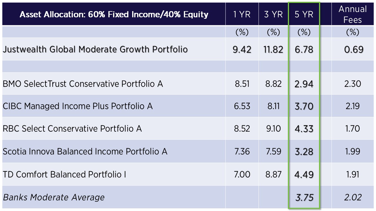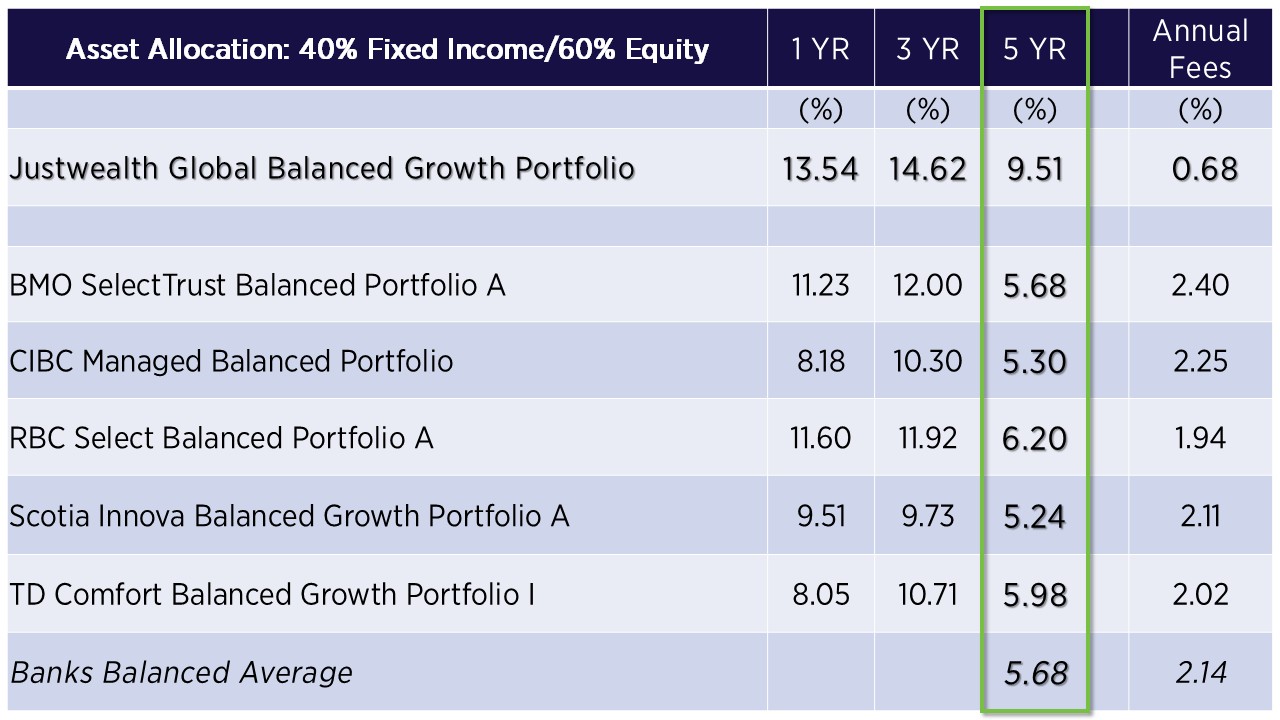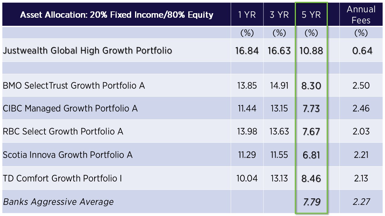 * The information presented above was obtained from sources which we believe to be reliable, but we cannot guarantee the accuracy of the information. The information does not constitute financial, tax, legal or any other kind of advice, nor is it an offer to buy or sell any securities. Rates of return are presented in Canadian dollars, annualized, and are net of the fees indicated. For additional details on the calculation of Justwealth rates of return, please refer to the disclosure on our performance page. Past performance is not a guarantee of future returns.