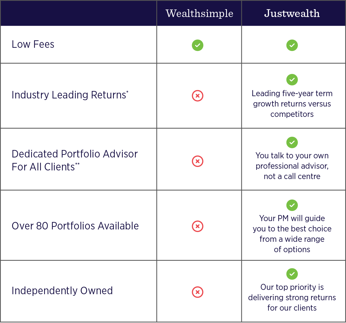 *For the fourth straight year, Justwealth had the highest five-year after-fee annualized total returns for the growth portfolio – Globe and Mail, Nov 28, 2024 – The Globe and Mail’s 2024 Robo-Adviser Guide. **Justwealth provides a dedicated Portfolio Advisor for all our clients, regardless of the size of their portfolio. Wealthsimple does not provide a dedicated Portfolio Advisor for their Core clients.